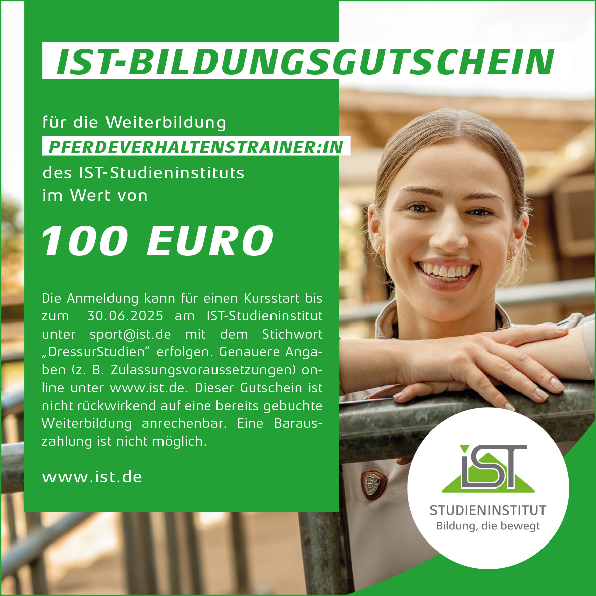 Der Gutschein gilt für die Weiterbildung PFERDEVERHALTENSTRAINER:IN des IST-Studieninstituts, beim Link findet Ihr auch weitere Infos z. B. zu den Zulassungsvoraussetzungen.