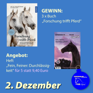 Wir verlosen dreimal das Buch „Forschung trifft Pferd“, was so gut ist, dass wir es auch in unseren Shop aufgenommen haben: Wert: je 40 Euro. Danke an den Kosmos-Verlag.