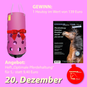 Wer nichts bestellt, kann ebenfalls mitmachen, indem er uns eine Mail an gewinnspiel@dressur-studien.de sendet. Diese Mail nimmt an dem Tag an der Verlosung teil, an dem wir sie erhalten haben.