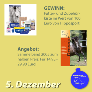 Wer nichts bestellt, kann ebenfalls mitmachen, indem er uns eine Mail an gewinnspiel@dressur-studien.de sendet. Diese Mail nimmt an dem Tag an der Verlosung teil, an dem wir sie erhalten haben.