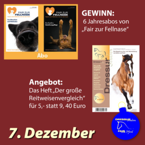 Wer nichts bestellt, kann ebenfalls mitmachen, indem er uns eine Mail an gewinnspiel@dressur-studien.de sendet. Diese Mail nimmt an dem Tag an der Verlosung teil, an dem wir sie erhalten haben.