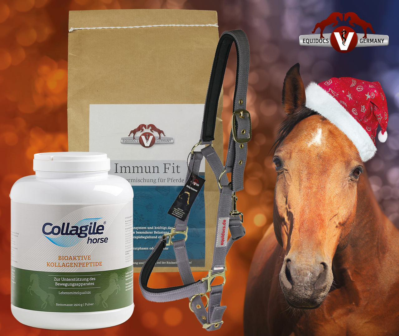 Heute kann sich ein glücklicher Gewinner gleich über drei tolle Preise freuen. Eine Dose Collagile Horse im Wert von 139 Euro, wer Collagile noch nicht kennt, dem sei diese Seite empfohlen: Collagile unterstützt Knochen, Sehnen und Muskeln und ist besonders für Tiere empfehlenswert, die Bewegungsprobleme haben. Dazu gibt es die Kräutermischung Imun fit und ein schönes Halfter. Wert des Gesamtpakets: 181 Euro. Danke an Equidocs für den Gewinn 🙂