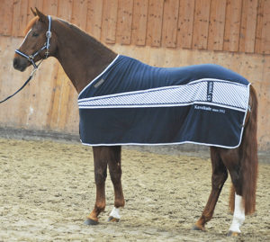 Eine schicke Abschwitzdecke „Superia Spezial“ mit einem – selbstverständlich – farblich passenden Sicherheitshalfter „Kavalastik“ von der Firma Kavalkade, im Wert von fast 120 Euro.