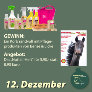 „Das Notfall-Heft: Erste Hilfe für das Pferd“ gibt es heute für 5,90, statt 8,90.- Euro. Unser Nachschlageheft für den Fall der Fälle, der hoffentlich nicht eintritt, aber auf den man vorbereitet sein muss!