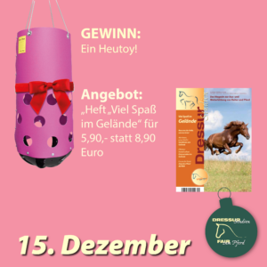 Wer nichts bestellt, kann ebenfalls mitmachen, indem er uns eine Mail an gewinnspiel@dressur-studien.de sendet. Diese Mail nimmt an dem Tag an der Verlosung teil, an dem wir sie erhalten haben.