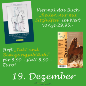 Wer nichts bestellt, kann ebenfalls mitmachen, indem er uns eine Mail an gewinnspiel@dressur-studien.de sendet. Diese Mail nimmt an dem Tag an der Verlosung teil, an dem wir sie erhalten haben.