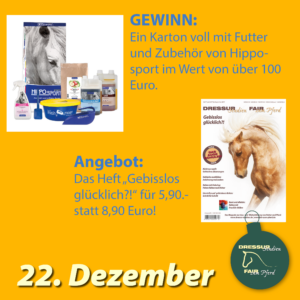 Wer nichts bestellt, kann ebenfalls mitmachen, indem er uns eine Mail an gewinnspiel@dressur-studien.de sendet. Diese Mail nimmt an dem Tag an der Verlosung teil, an dem wir sie erhalten haben.