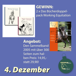 Wer nichts bestellt, kann ebenfalls mitmachen, indem er uns eine Mail an gewinnspiel@dressur-studien.de sendet. Diese Mail nimmt an dem Tag an der Verlosung teil, an dem wir sie erhalten haben.