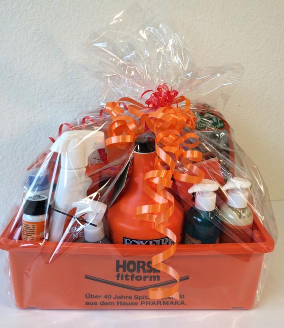 Ein Korb bis oben hin gefüllt mit Pflegeprodukten der Firma Pharmaka/Horse Fitform: Perfekte Pflege von Huf bis Schweif für Ihr Pferd im Wert von 160 Euro.