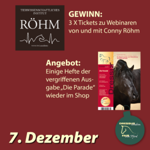 Wer nichts bestellt, kann ebenfalls mitmachen, indem er uns eine Mail an gewinnspiel@dressur-studien.de sendet. Diese Mail nimmt an dem Tag an der Verlosung teil, an dem wir sie erhalten haben.