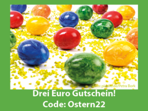 Geben Sie bei Ihrer Bestellung ins Gutscheinfeld einfach diesen Code ein: Ostern22 und es werden Ihnen automatisch drei Euro von der Rechnung abgezogen!