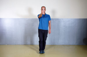 Stehen Sie gerade mit komplett geschlossenen Beinen, die Arme nach vorn waagerecht und parallel gestreckt. Schließen Sie dann die Augen. Sie sollten 30 Sekunden so stehen können, ohne mit den Armen Ausgleichsbewegungen durchzuführen. Wenn das einfach klappt, stellen Sie eine Ferse vor die Zehenspitze des anderen Fußes und probieren es in dieser schwierigeren Position. Wenn das auch klappt, fangen sie mit geschlossenen Augen an, den Kopf in verschiedene Richtungen zu rotieren, ihn zur Seite, nach hinten und nach vorn zu kippen.
