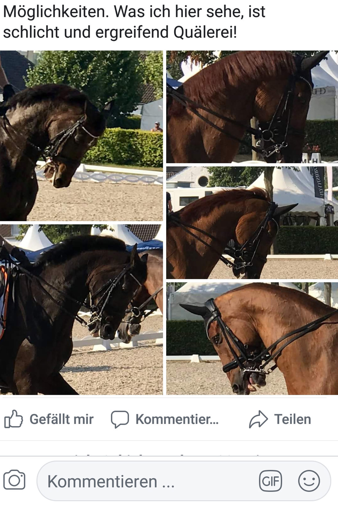 Jetzt ist es nicht an der Zeit schrille Pauschalurteile („Ein paar Bilder, die für ausnahmslos alle Reiter stehen die ich gestern und heute gesehen habe.“) zu fällen. Sondern die feinen Reiter weiter zu unterstützen, weiter aufmerksam an Abreiteplätzen zu sein und: im Dialog zu bleiben. Die Reiterwelt besteht nicht nur aus rollkurenden Reitern. Oder aus Pferden mit Wallemähnen, die am Halsring geritten werden. Etwas Augenmaß täte uns allen gut – und besonders den Pferden.