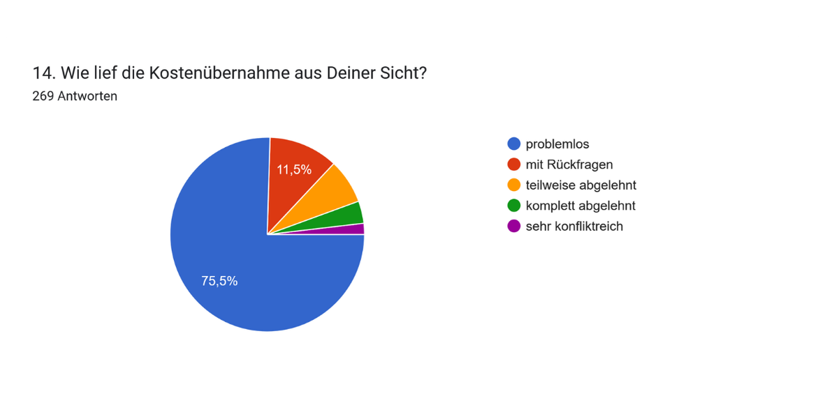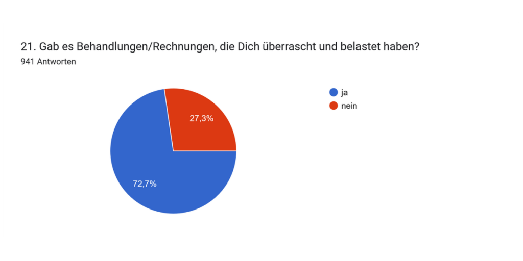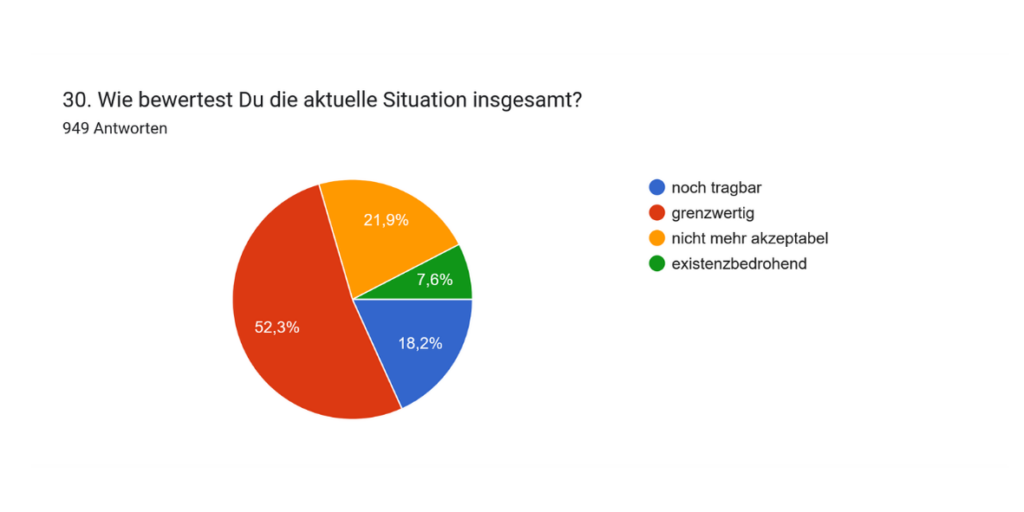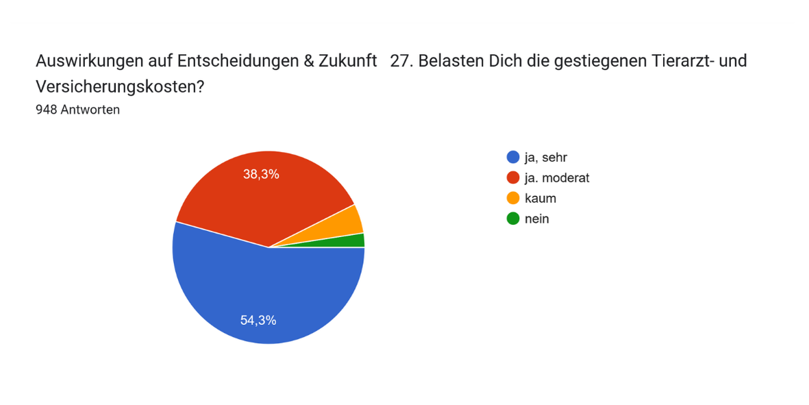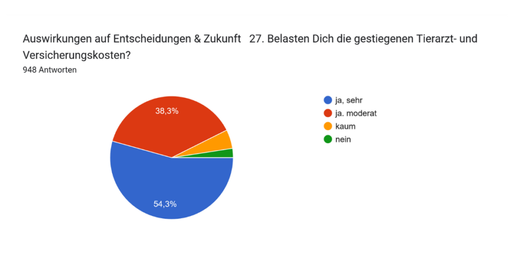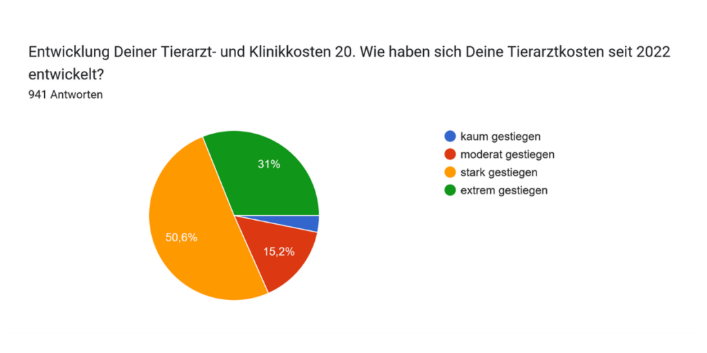 Gefragt wurde nach der Entwicklung der Tierarztkosten, wobei folgende Antwortmöglichkeiten zur Auswahl standen: 1. kaum gestiegen, 2. moderat gestiegen, 3. stark gestiegen und 4. extrem gestiegen. Dass die Kosten stark gestiegen seien, gaben 50,6 % der Befragten an, als extrem stark gestiegen empfanden 31,6 % die Auswirkungen der GOT.