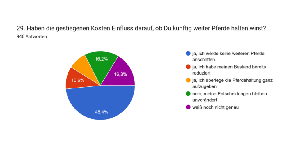 Diese massive Kostensteigerung schlägt sich unmittelbar in den Entscheidungen der Pferdebesitzer nieder. 49 % der Befragten gaben an, dass sie Diagnostik später anfordern. 43 % sagten, dass sie auf bestimmte Behandlungen verzichten würden, und nur 26,7 % erklärten, dass die Kostensteigerung keine Auswirkungen auf ihre Entscheidungen rund um die Gesundheit ihrer Pferde habe. Bei dieser Frage waren Mehrfachantworten möglich. Besonders ernüchternd: 48,4 % gaben an, dass sie sich keine weiteren Pferde mehr anschaffen werden.