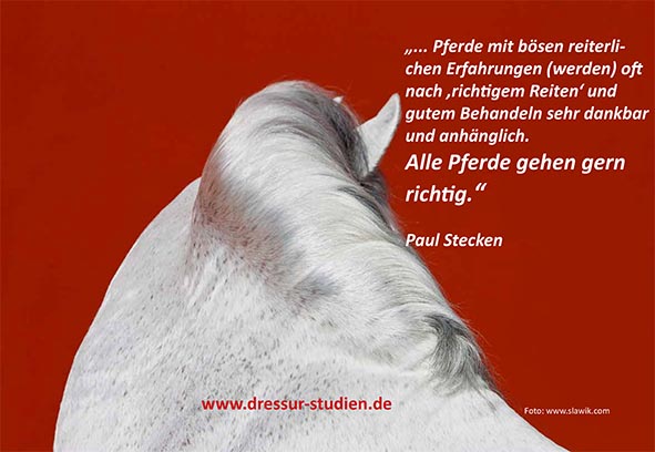 6 Feb. 2016 Home » Neuigkeiten » Zitat des Tages: Pferde gehen gern richtig!Zitat des Tages: Pferde gehen gern richtig! Geposted in Zitat des Tages, Neuigkeiten | 0 „… Pferde mit bösen reiterlichen Erfahrungen (werden) oft nach ‚richtigem Reiten‘ und gutem Behandeln sehr dankbar und anhänglich. Alle Pferde gehen gern richtig.“ Paul Stecken in „Bemerkungen und Zusammenhänge“.