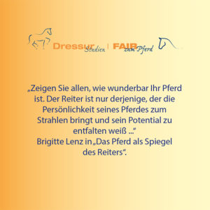 „Zeigen Sie allen, wie wunderbar Ihr Pferd ist. Der Reiter ist nur derjenige, der die Persönlichkeit seines Pferdes zum Strahlen bringt und sein Potential zu entfalten weiß …“